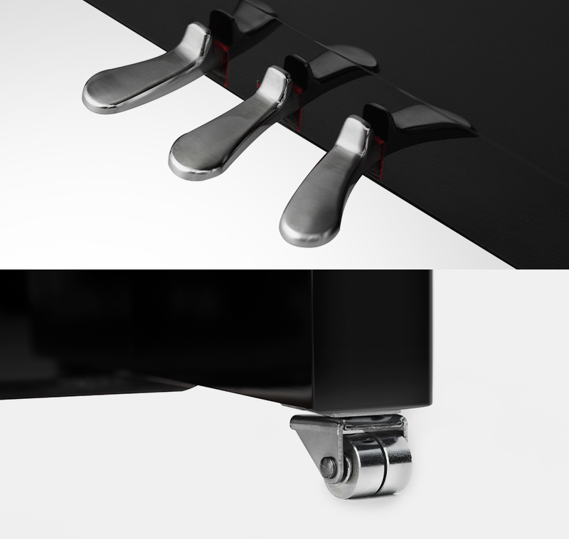 鍵盤蓋LOGO、鑄鐵板、踏板、腳輪等銀色金屬元素,與時尚簡約的現代風格家居內飾相得益彰。